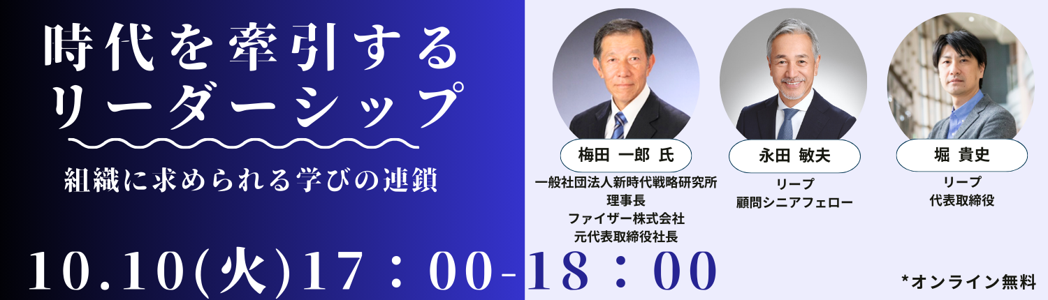 ファイザー株式会社 元代表取締役社長の梅田一郎氏をお迎えし、弊社の堀と永田の3人で「時代を牽引するリーダーシップ」について議論いたします。本音を交え、ざっくばらんにトークいたしますので、ご興味がございましたら是非お気軽にご参加ください。無料・事前登録不要です。