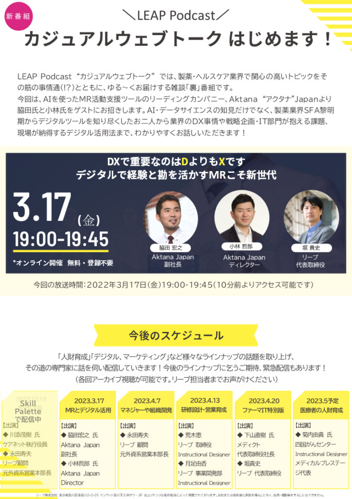 リープ株式会社では、“LEAP Podcast カジュアルウェブトーク“と題したウェブセミナーの定期的な配信をスタートいたしました。
