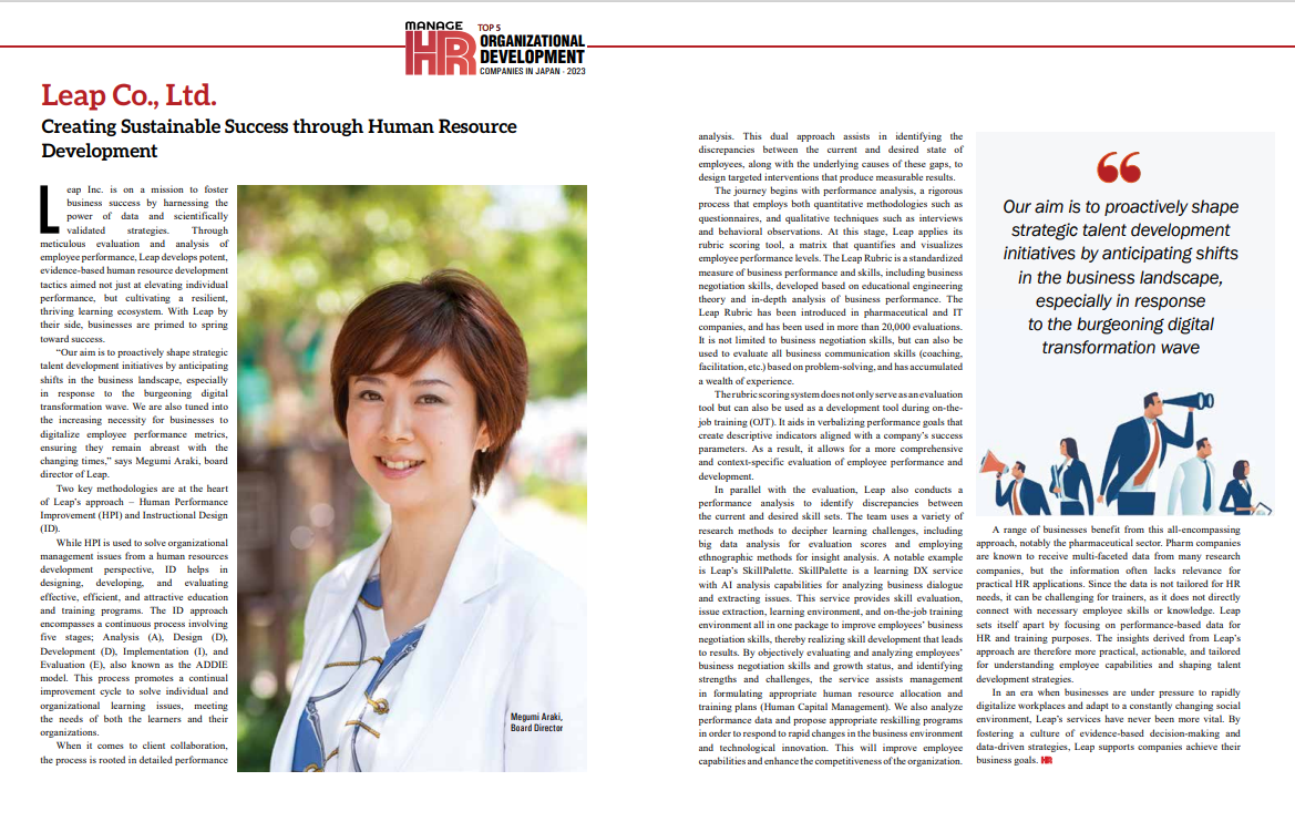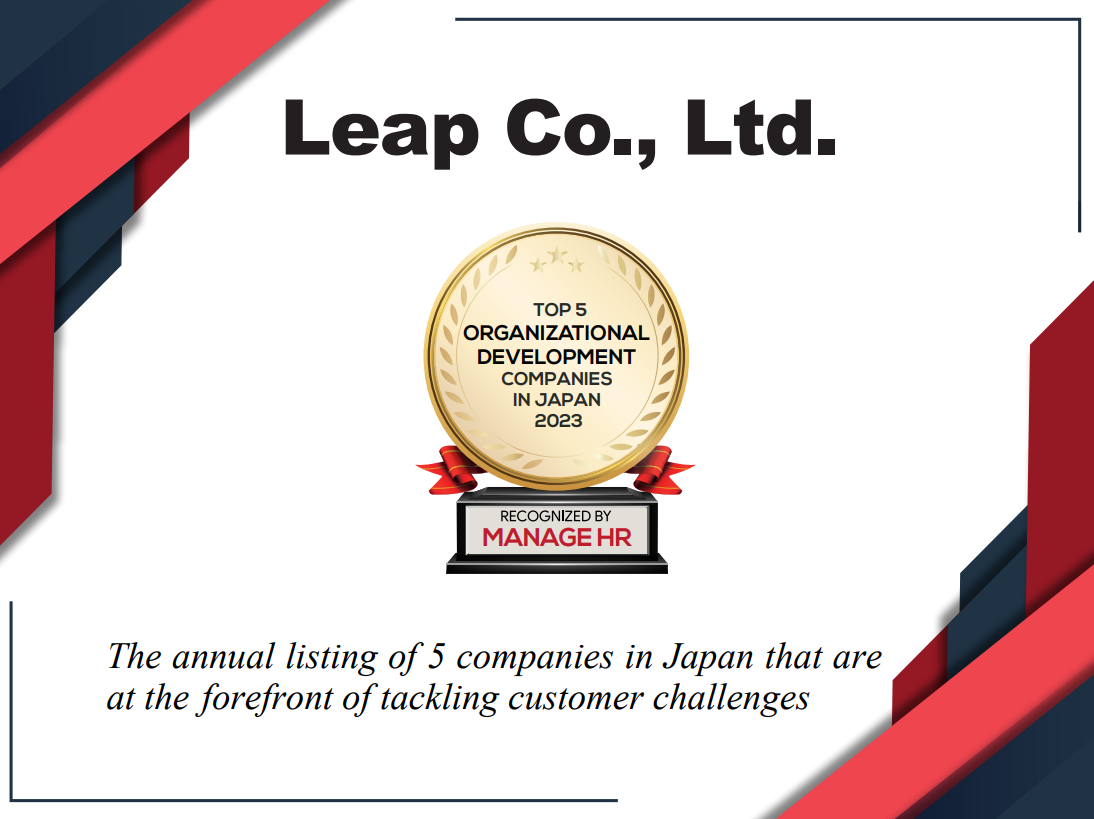 リープ株式会社(東京都品川区/代表取締役:堀貴史)は、アメリカのHRメディア・Manage HR Magazineが主催する「ORGANIZATIONAL DEVELOPMENT COMPANIES IN JAPAN 2023」のTOP5に認定されました。