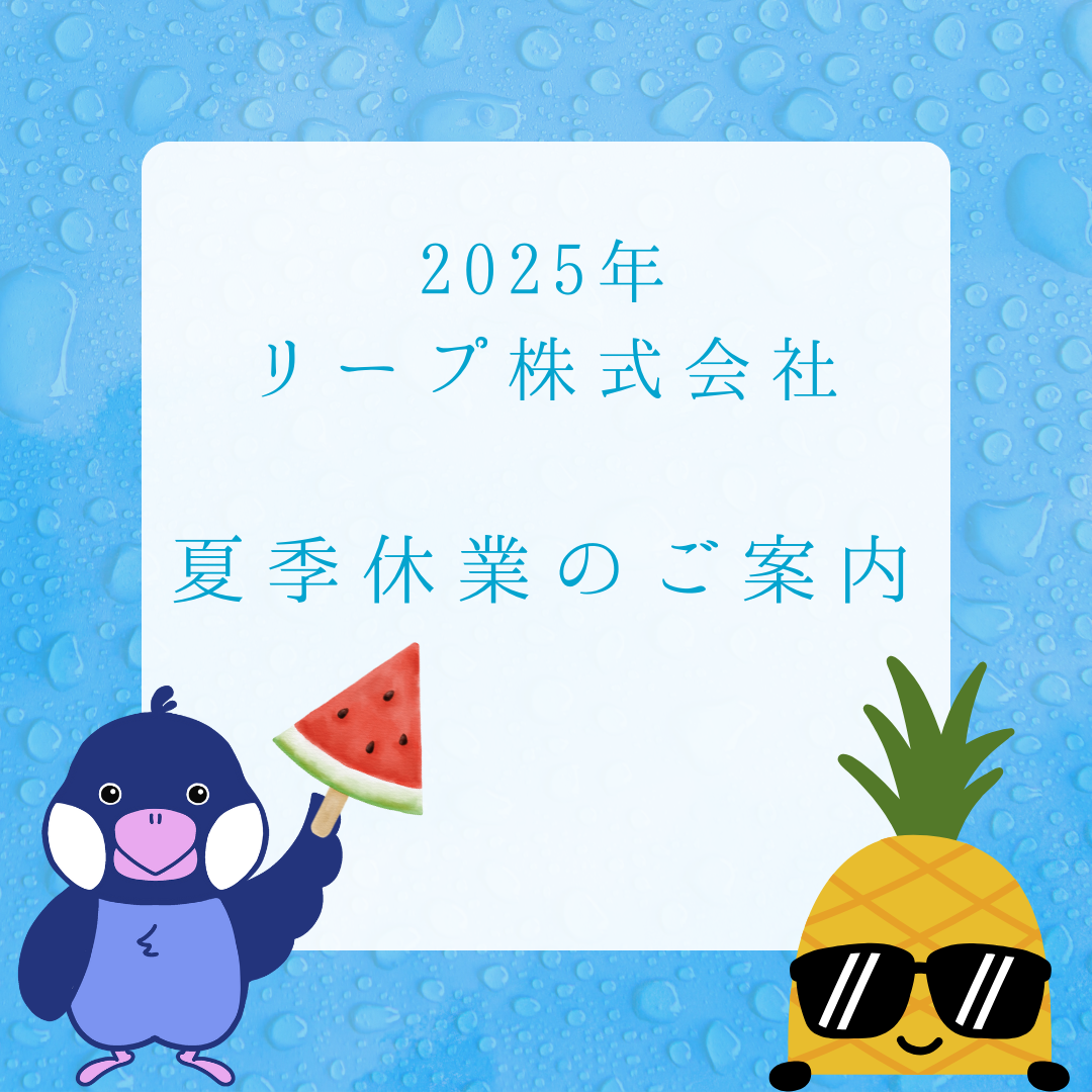 夏季休業のお知らせ(2025年) 誠に勝手ながら、リープでは下記の期間を夏季休業とさせて頂きます。 2025年8月11日(月)~8...